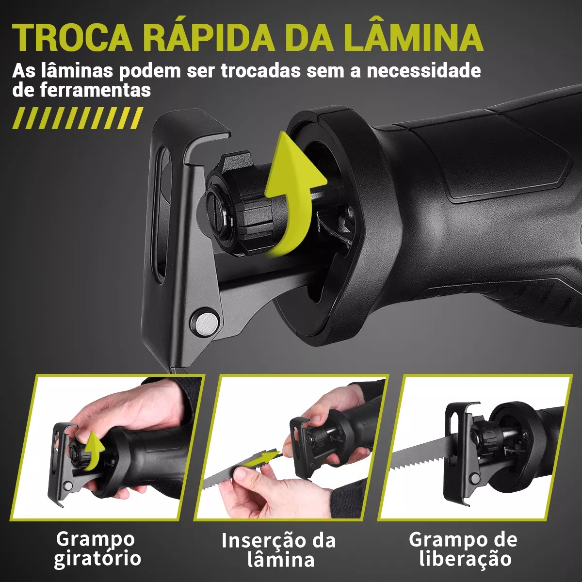 Operação simples: basta inserir a lâmina de serra e pressionar o interruptor de gatilho para começar a trabalhar. Não são necessárias ferramentas para trocar a lâmina usando o mandril de troca rápida. Gira para contornar facilmente os objetos durante o corte.